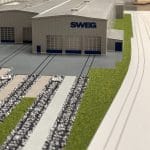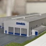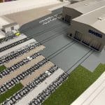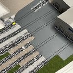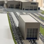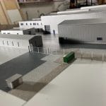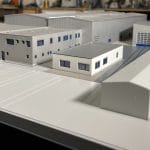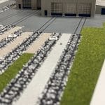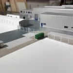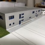 Farbiges, detailliertes Architekturmodell auf einer Modellplatte, mit Außenanlagen, mit Abdeckhaube aus Plexiglas